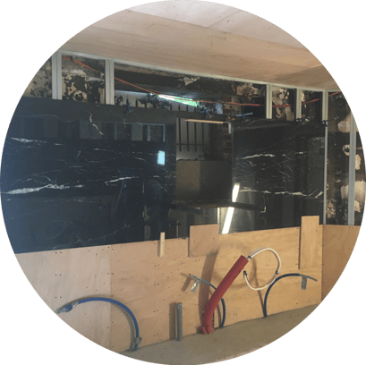Les équipes du Monde de la Pierre viennent de finir un nouveau chantier remarquable : les cuisines du Donjon - Domaine Saint Clair à Etretat. Sol en terrazzo et habillage mural en marbre noir.