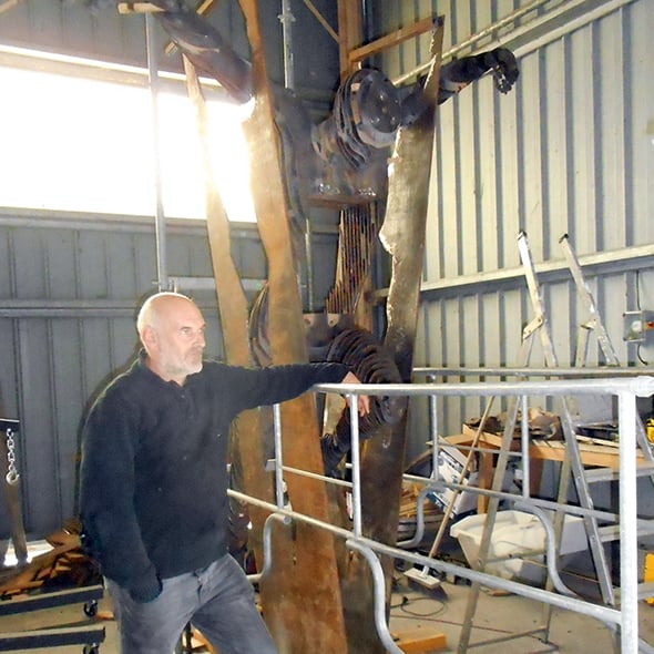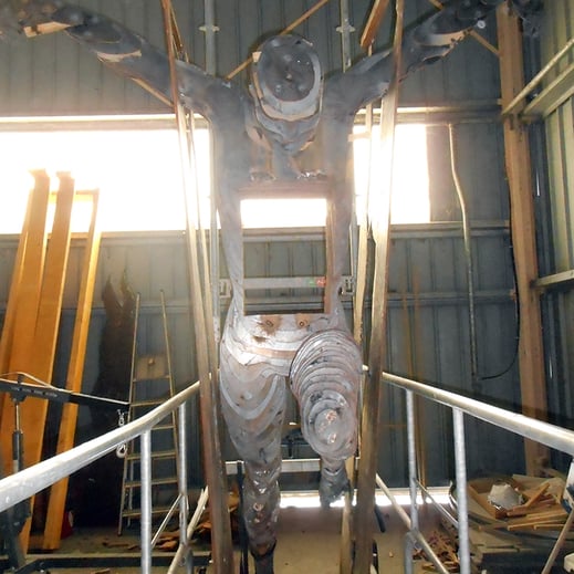 Pour créer sa sculpture monumentale, Yves Durand avait besoin d'espace. Il l'a trouvé au Monde de la Pierre. Notre équipe s'est chargée de la découpe des pièces dessinées par le plasticien. "La découpe au jet d'eau permet une grande précision" explique-t-il. Ensuite, l'assemblage s'effectue dans un des hangars de l'entreprise.