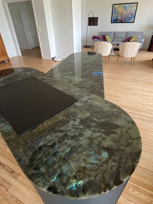 Aujourd'hui, on le trouve beaucoup en cuisine pour les plans de travail. Il permet une grande créativité dans les couleurs, les grains et chaque pièce coulée est unique ! (> le potentiel graphique du terrazzo)