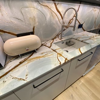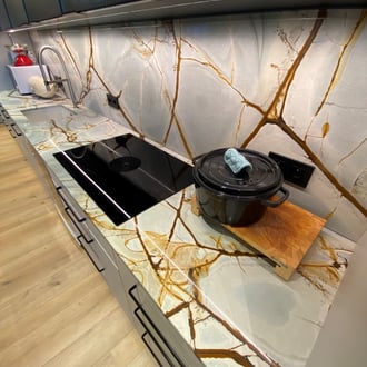 Et que dire d'un plan de travail en quartzite Taj Mahal ? On aime ses nuances jaune or et ses veinages couleur châtaigne.
